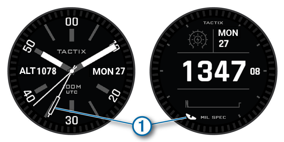 Default Watch Faces ① Coordinated Universal Time (UTC) hand. References the 24-hour time markings on the watch. HomeIntroductionGetting StartedDefault Watch Faces