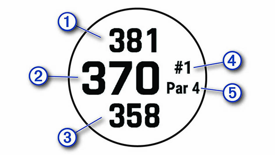 หมายเหตุ: เนื่องจากตำแหน่งธงเปลี่ยนได้, อุปกรณ์คำนวณระยะทางไปถึงด้านหน้า, ตรงกลาง, และด้านหลังของกรีน แต่ไม่ใช่ตำแหน่งธงที่แท้จริง