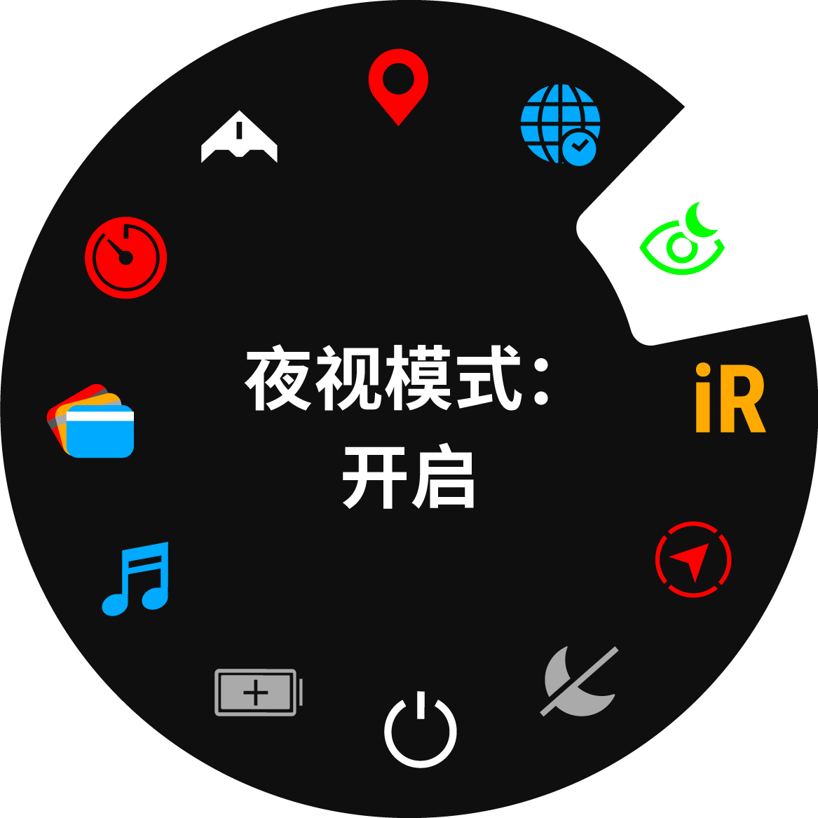 控制菜单内有快捷菜单选项,例如打开勿扰模式、锁定按键以及设备关机等。您可以开启隐蔽模式及夜视模式。您还可以开启Garmin Pay钱包。