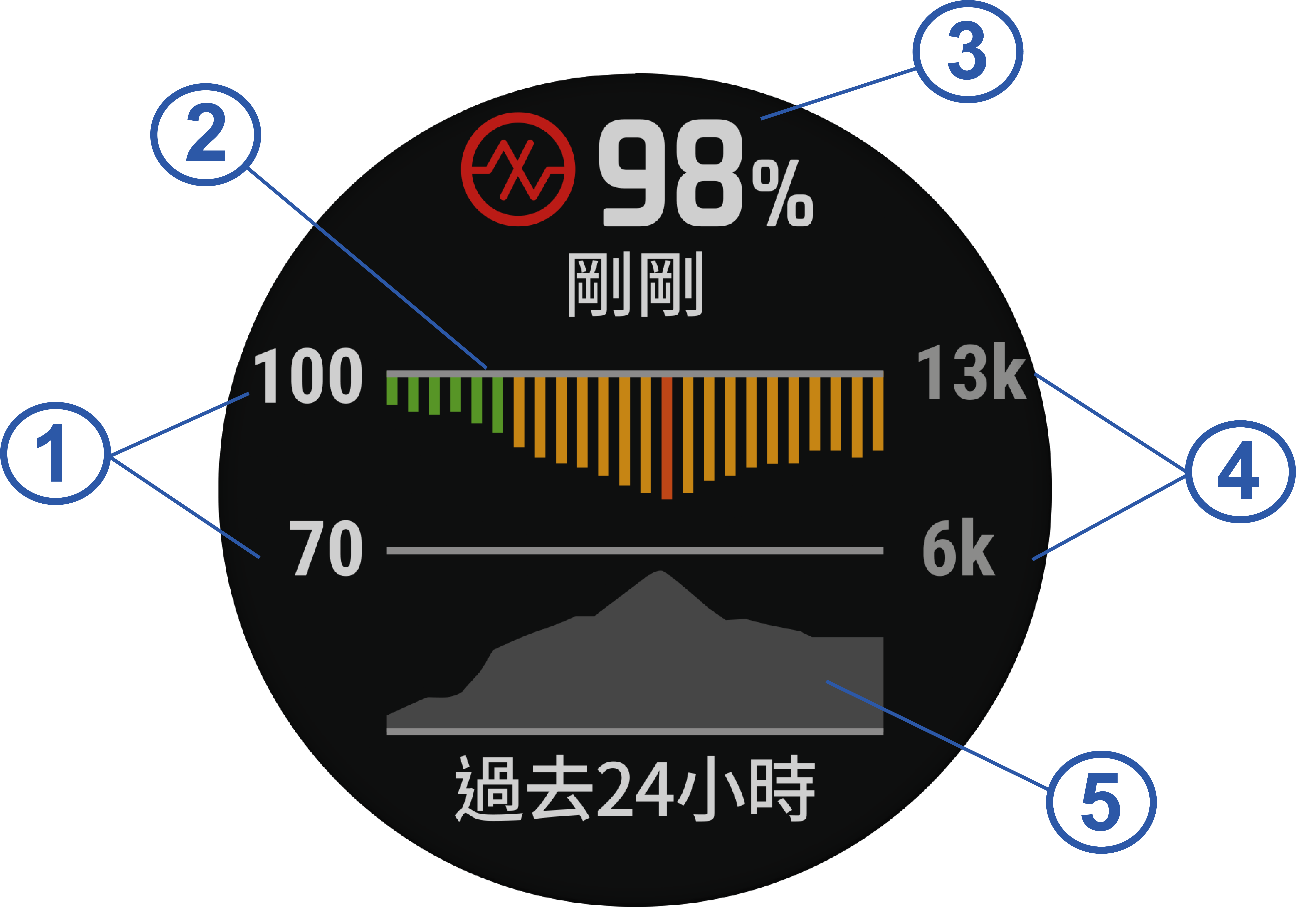 脈搏血氧感測功能以圖形、百分比和顏色顯示血氧飽和度。您可以在 Garmin Connect 檢視有關脈搏血氧功能的其他詳細資訊,以及過去特定期間的趨勢。更多關於活動追蹤準確度的資訊,請參考 Garmin.com.hk/legal/atdisclaimer。