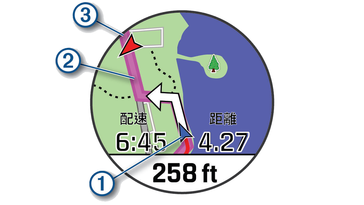 活動中導航至起始點您可以導航回路線起點或沿跡返航,但此功能僅適用於 GPS 有開啟的活動。 活動進行時,按下 STOP 鍵。 選擇 回到起點 並選擇一個選項:選擇 返航 沿跡返航至起點。如果沒有載入地圖或正在使用直線導航,請選擇 航線 以直線導航回到活動的起點。如果沒有在使用直線導航,請選擇 航線 以即時轉彎提示返回活動的起點。 您的目前位置 ①、行進路線 ② 與終點 ③ 會顯示在地圖上。檢視路線方向首頁導航活動中導航至起始點