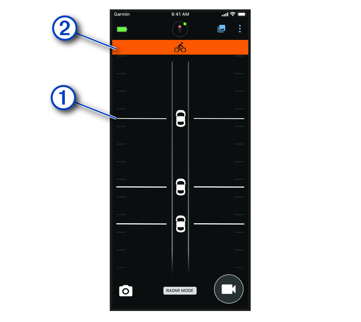 차량이 자전거에 더 가까이 다가오면, 차량의 위치①는 화면 위쪽으로 이동합니다. 위협 수준 배너②는 잠재적인 위협 수준에 따라 색상이 바뀝니다. 녹색은 차량이 감지되지 않음을 나타냅니다. 황색은 차량이 접근하고 있음을 나타냅니다. 적색은 차량이 고속으로 접근하고 있음을 나타냅니다.