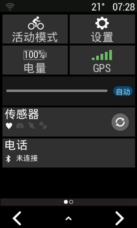 查看小工具设备出厂时已预载多个小工具。若您将设备与智能手机或其他兼容设备进行配对后,还有更多小工具可供使用。 在主页面,从屏幕顶部向下轻滑。设置工具显示,闪烁的图标表示设备正在搜索信号,常亮图标表示已找到信号或传感器已连接。您可选择任意图标以更改设置。 向左或向右轻滑以查看更多小工具。 下次当您向下轻滑查看小工具时,将显示您最后查看的小工具。主页Varia RTL515 和您的 Edge 1030查看小工具