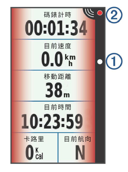 在您的 Edge 裝置上檢視雷達 開始騎乘。雷達資訊會顯示於訓練頁面上。車輛位置 LED ① 將隨車輛接近自行車的程度在側邊長條上往上移動。警報程度指示燈 ② 將依照潛在的危險程度變換燈號顏色。綠燈表示未偵測到車輛,橘燈表示有車輛接近中,紅燈則表示車輛正以高速接近。首頁Varia RVR315 和您的 Edge 1030在您的 Edge 裝置上檢視雷達