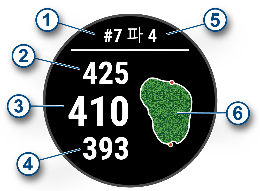 기본적으로 장치가 그린 앞, 뒤, 선택된 핀 위치까지의 거리를 계산합니다 (14 페이지, 핀의 위치 변경하기).