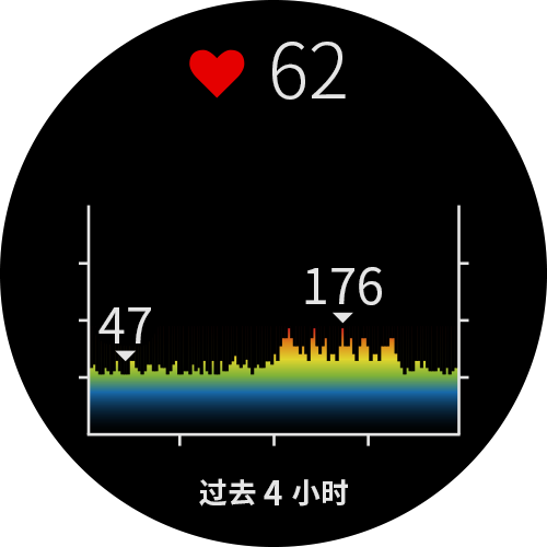 查看心率小工具心率小工具以每分钟心跳次数(bpm)显示您目前的心率与心率图表。该图表显示最近心率活动的最高与最低心率,并以彩色柱状图区分各时间内的心率区间(关于心率区间,第7页)。 在时间界面,上下滑动屏幕以查看心率小工具。 点击屏幕查看过去七天的平均静止心率(RHR)。 主页心率功能腕式心率查看心率小工具