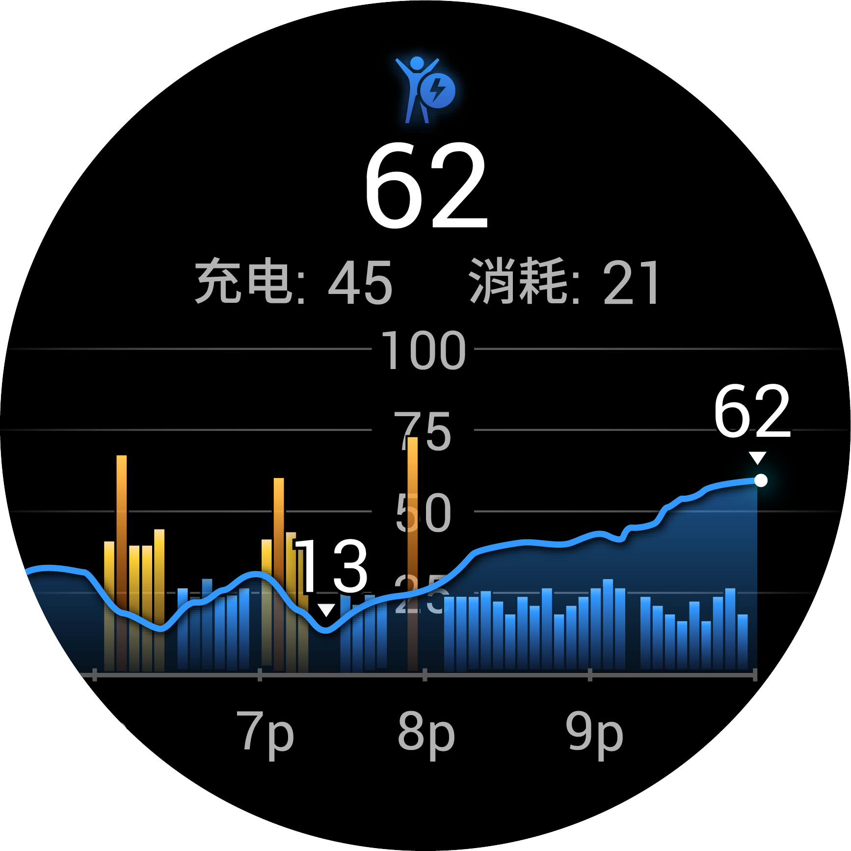 查看身体电量小工具身体电量小工具显示您当前的身体电量水平。 向上滑动屏幕查看身体电量小工具。小贴士:您可能需要将小工具添加到工具列表(自定义小工具,第10页)。 轻触小工具,查看午夜至今的身体电量趋势图。 向上滑动以查看身体电量和压力分数的组合趋势图。 主页小工具身体电量查看身体电量小工具