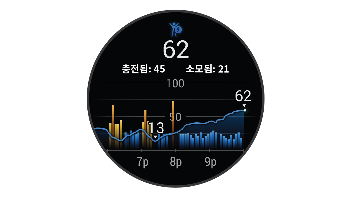 - 바디 배터리와 스트레스 수준을 모두 보여주는 그래프를 보려면 화면을 위로 스와이프합니다.