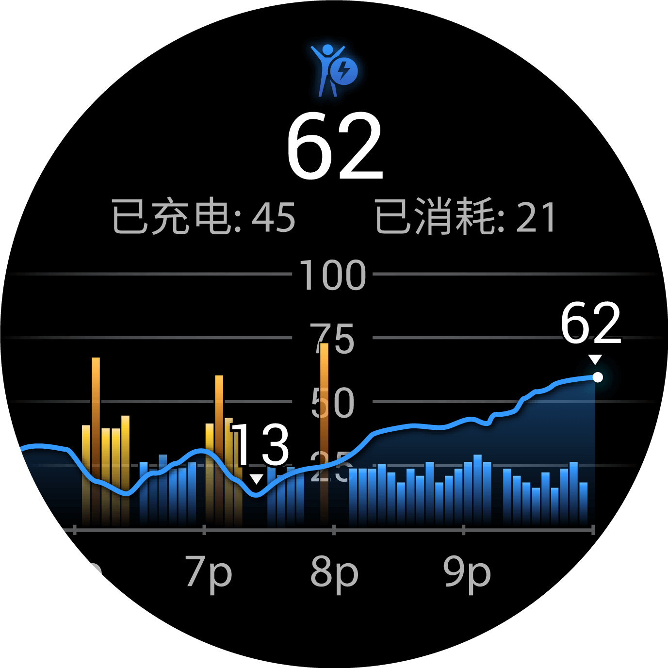 查看身体电量小工具 身体电量小工具显示您当前的身体电量水平。 向上滑动屏幕查看身体电量小工具。小贴士:您可能需要将小工具添加到工具列表(自定义小工具,第10页)。 轻触小工具,查看午夜至今的身体电量趋势图。 向上滑动以查看身体电量和压力分数的组合趋势图。 主页小工具身体电量查看身体电量小工具