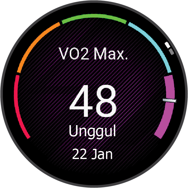 Perkiraan VO2 max. Anda muncul sebagai angka, deskripsi, dan posisi pada indeks warna di perangkat. Anda dapat melihat detail tambahan tentang perkiraan VO2 max. di akun Garmin Connect Anda, seperti penilaian umur dan jenis kelamin Anda.