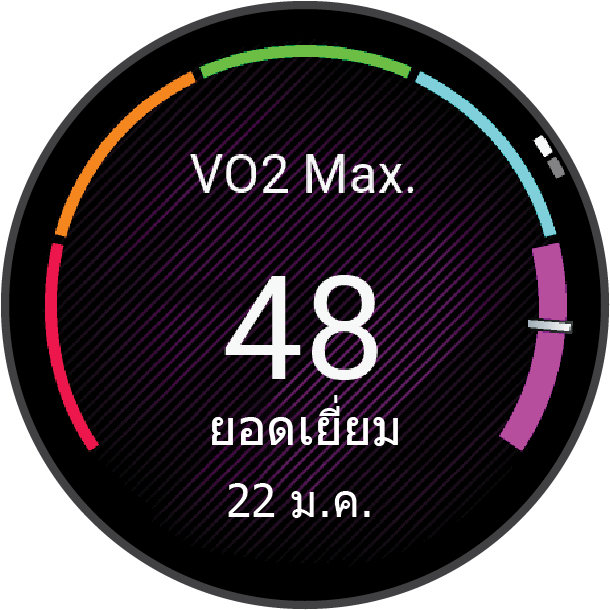 บนอุปกรณ์ การประมาณค่า VO2 max ของคุณปรากฏเป็นตัวเลข คำอธิบาย และตำแหน่งบนมาตรสี บนบัญชี Garmin Connect ของคุณ คุณสามารถดูข้อมูลเพิ่มเติมเกี่ยวกับการประมาณ VO2 max เช่นระดับที่เท่าใดสำหรับอายุและเพศของคุณ