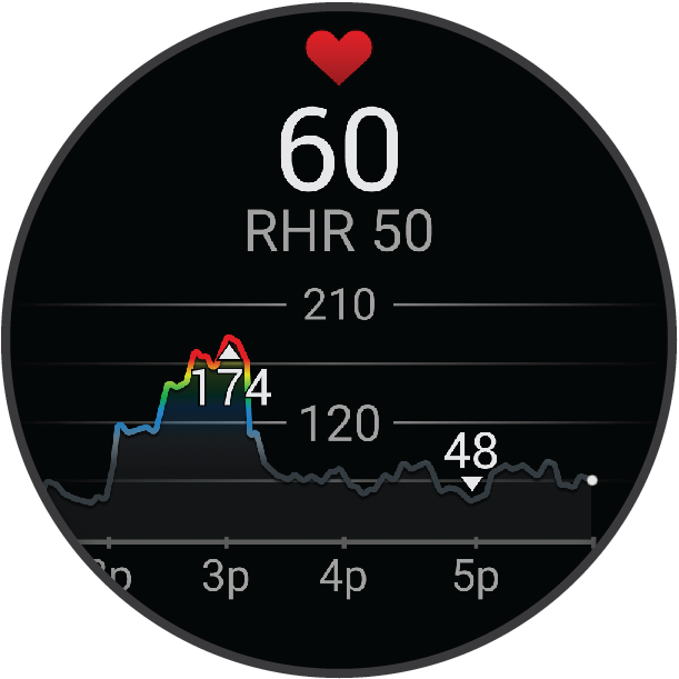 心率小工具以每分钟心跳(bpm)为单位显示当前心率值。有关心率准确性的更多信息,请前往 Garmin.com/zh-CN/legal/atdisclaimer。