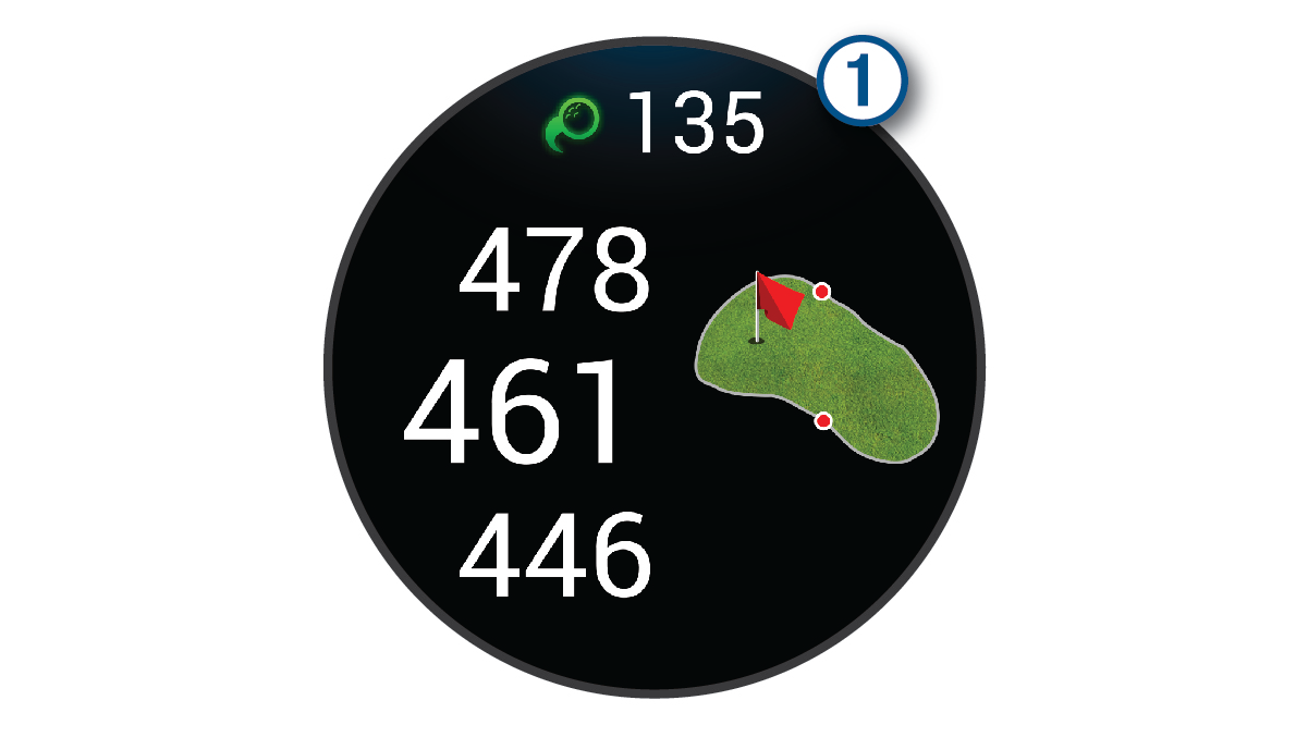 当您在球道上挥杆,腕表界面顶部会显示一个距离数字 ① 。