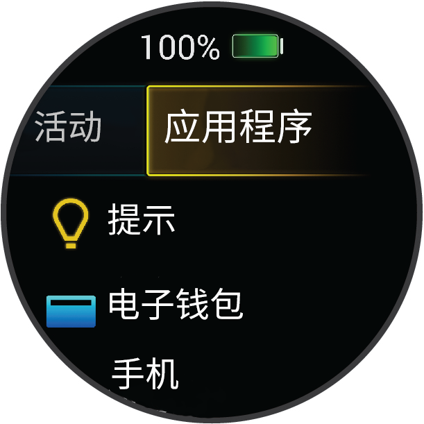 您可自定义腕表上的应用程序列表,以快速访问腕表功能及选项。部分应用需通过蓝牙连接到兼容的手机。许多应用程序也可在小工具中找到(小工具,第10页)。
