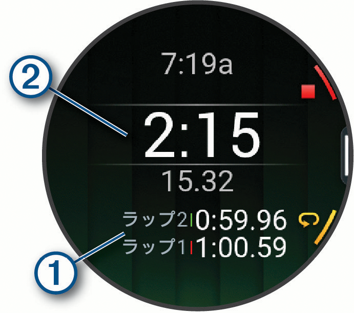 を押してタイマーを開始します。- ラップ①を取得するには、
