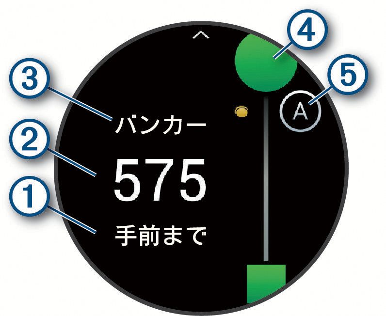 ハザードを確認するパー4およびパー5のホールでは、ハザード情報を確認できます。 を押します。 [ハザード]を選択します。最も近いハザードの手前および奥までの対象地点①と距離②が表示されます。画面上部にハザードタイプ③が表示されます。グリーンは画面の上部に半円④で表示されます。グリーンから下に延びる線はフェアウェイを表現しています。ハザード⑤はホール内での並びに合わせてアルファベットで表されています。また、表示位置はフェアウェイとの位置関係も表しています。 ホームアクティビティ&アプリアクティビティ - ゴルフハザードを確認する