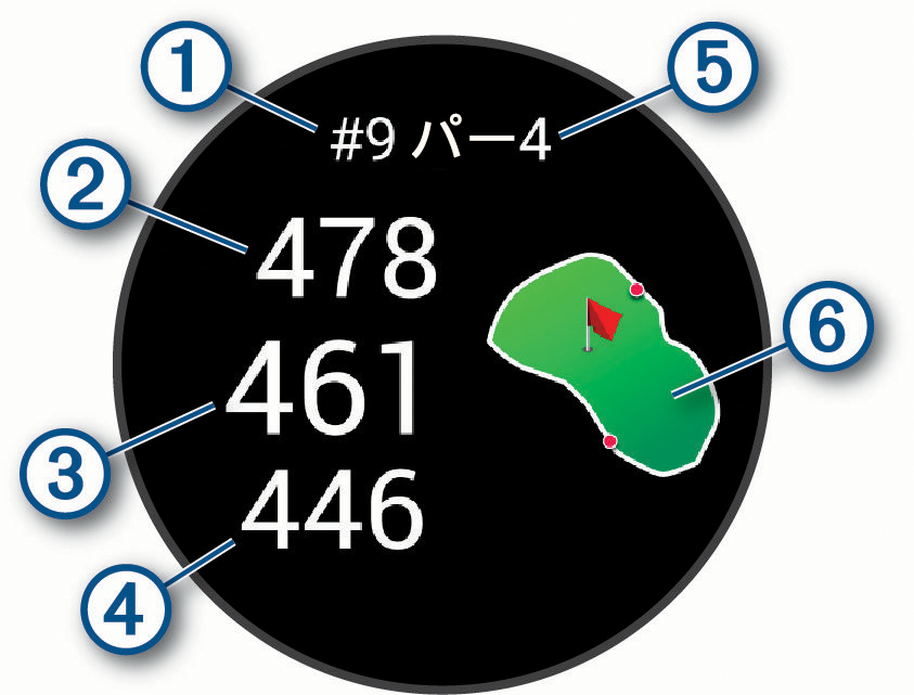 - 注意:画面に表示されている数字は、グリーンの奥/中央/手前までの距離を示します。実際のグリーン上のピンの位置までの距離を表すものではありません。