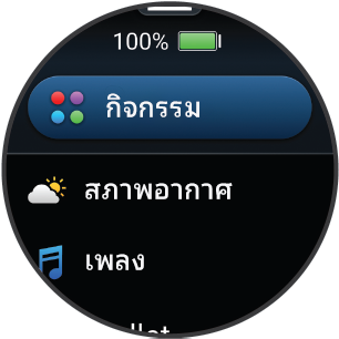 จากหน้าปัดนาฬิกา ปัดซ้าย เลือก กิจกรรม รายการกิจกรรมโปรดของคุณจะปรากฏอยู่ที่ด้านบนของรายการ (การปรับแต่งรายการกิจกรรมโปรดของคุณ)