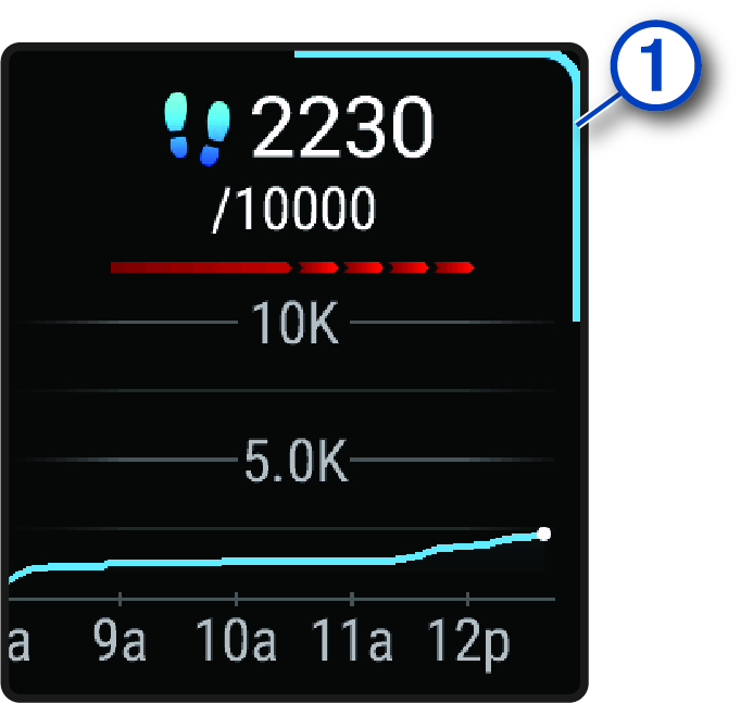 목표 자동 생성(Auto Goal)이전 활동 수준을 기준으로 시계에서 자동으로 일일 스텝 목표를 만듭니다. 하루 동안 움직임에 따라 시계에서 일일 목표①에 대한 진행 상황을 보여줍니다.목표 자동 생성 기능을 사용하지 않기로 선택하였다면, Garmin Connect 계정에서 자신만의 단계 목표를 설정할 수도 있습니다.홈훈련운동량 측정목표 자동 생성(Auto Goal)