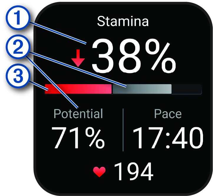 Primary stamina data field. Shows your current stamina percentage, distance remaining, or time remaining. |