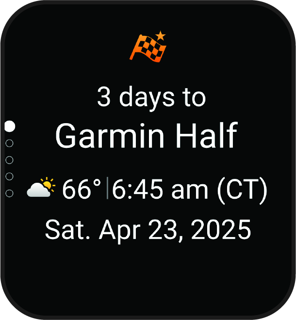 When you add a race event to your Garmin Connect calendar, you can view the event on your watch by adding the primary race glance (Glances). The event date must be in the next 365 days. The watch displays a countdown to the event, your goal time or predicted finish time (running events only), and weather information.