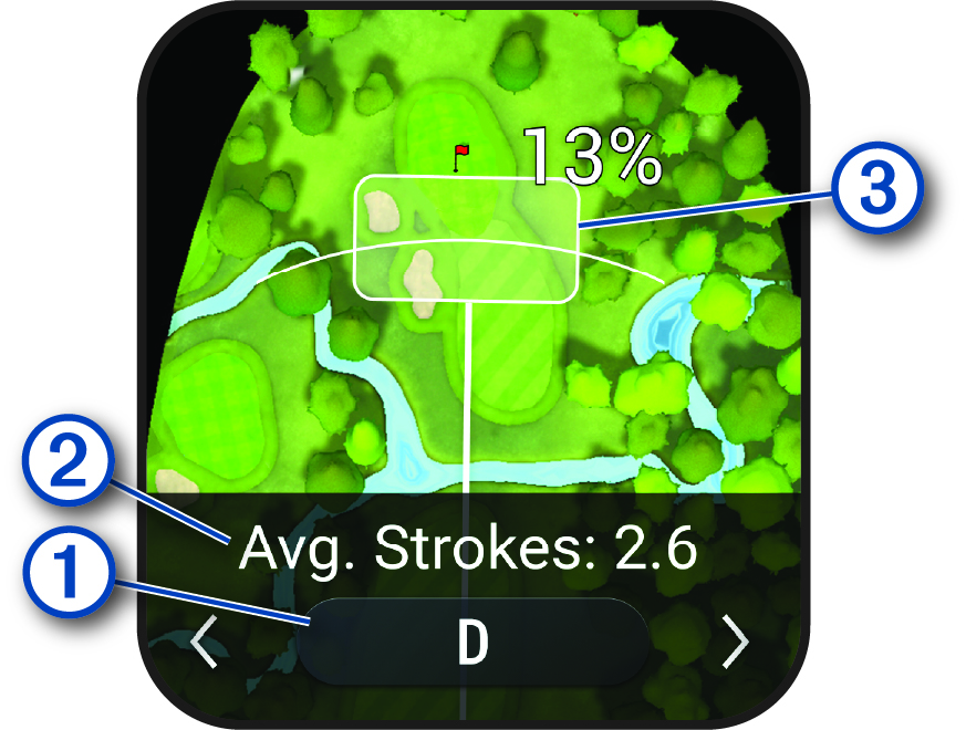 Displays the shot dispersion area for your next shot with the club recommendation, based on your shot history with the club. NOTE: If the shot dispersion area overlaps with the green, the shot’s chances of reaching the green will display as a percentage. |