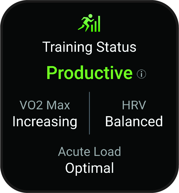 Training status: Training status shows you how your training affects your fitness and performance. Your training status is based on changes to your VO2 max., acute load, and HRV status over an extended time period.