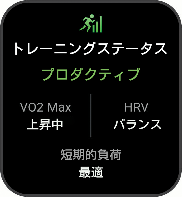 トレーニングステータス:VO2 Maxと短期的負荷、HRVステータスの長期間のデータを基に、トレーニングが自身のパフォーマンスにもたらす効果を示します。