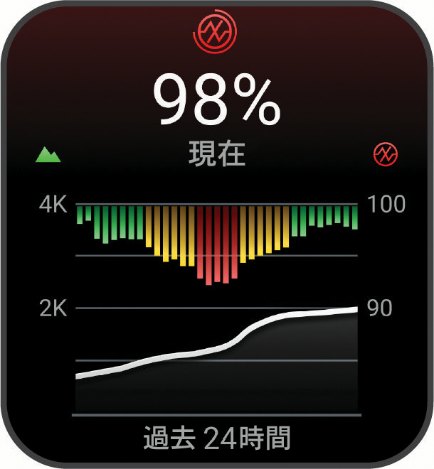血中酸素トラッキング機能で、血液中に取り込まれた酸素のレベルを測定することができます。高地での活動に参加する場合、血中酸素レベルは身体の順応状態の参考となり、高度の変化に伴う血中酸素レベルの増減を追跡するのに役立ちます。また、普段の生活のなかで身体的パフォーマンスに関する洞察を得ることができ、個人の健康の長期的な傾向を追跡するのに役立ちます。