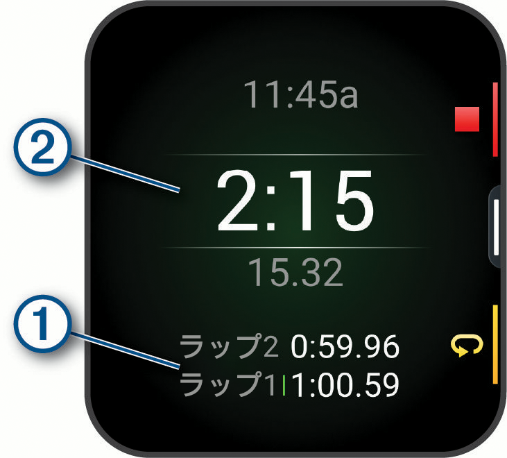 を押してタイマーを開始します。- ラップ①を取得するには、