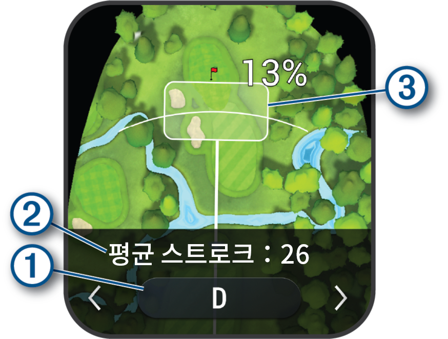 클럽 추천에 따른 다음 샷의 분포 영역을 표시합니다. 이는 해당 클럽으로의 샷 기록에 기반합니다. 참고: 만약 샷의 분포 영역이 그린과 겹친다면, 샷이 그린에 도달할 확률을 백분율로 표시합니다. |