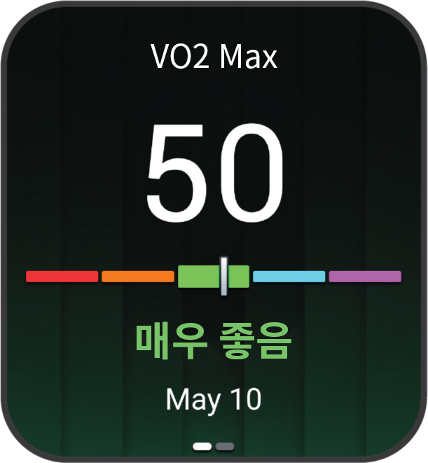 VO2 Max.는 최대 운동 성과에서 체중 1킬로그램 당 1분마다 소비할 수 있는 최대 산소량(단위:밀리리터)입니다. 좀더 간단하게 말하자면 VO2 max.는 운동선수의 성과를 나타내는 지표로서 운동 능력이 향상되면 이 수치도 증가합니다. Venu X1 장치에서 VO2 Max 추정치를 표시하려면 손목 심박수 측정 기능 또는 호환되는 가슴 심박계가 필요합니다. 장치는 러닝과 사이클링(자전거 운동)을 위한 별도의 VO2 Max 추정 기능을 가지고 있습니다. 정확한 VO2 Max 추정치를 얻기 위해서는 수 분 동안 중간 정도의 운동 강도로 GPS를 착용한 상태에서 실외를 달리거나 호환 파워 미터를 장착한 상태에서 라이딩을 실시해야 합니다.
