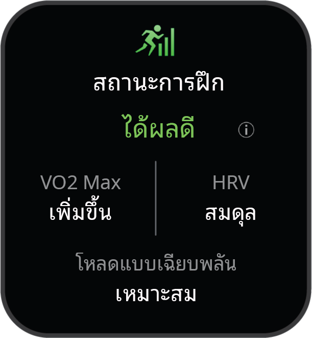 สถานะการฝึกซ้อม: สถานะการฝึกซ้อมแสดงให้คุณเห็นว่าการฝึกซ้อมของคุณส่งผลกระทบต่อสุขภาพและสมรรถนะของคุณอย่างไร สถานะการฝึกซ้อมของคุณขึ้นอยู่กับการเปลี่ยนแปลงใน VO2 max ภาระฉับพลัน และสถานะ HRV ของคุณผ่านช่วงระยะเวลาที่ยาวขึ้น