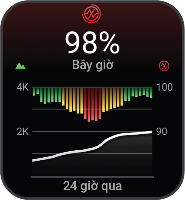 Trên đồng hồ, các chỉ số đo nồng độ oxy của bạn xuất hiện dưới dạng tỷ lệ phần trăm bão hòa oxy và màu sắc trên biểu đồ. Trên tài khoản Garmin Connect của bạn, bạn có thể xem các thông tin chi tiết bổ sung về các chỉ số đo nồng độ oxy của bạn, bao gồm các xu hướng trong nhiều ngày.