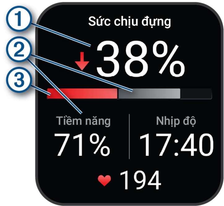 Trường dữ liệu thể lực chính. Hiển thị phần trăm thể lực hiện tại của bạn, khoảng cách còn lại hoặc thời gian còn lại. |