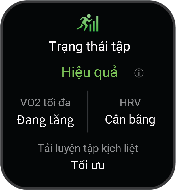Trạng thái luyện tập: Trạng thái luyện tập cho biết việc luyện tập ảnh hưởng đến thể lực và hiệu suất của bạn như thế nào. Trạng thái luyện tập của bạn dựa trên các thay đổi về chỉ số VO2 tối đa, tải cường độ luyện tập, và trạng tháu tahy đổi nhịp tim trong khoảng thời gian dài.
