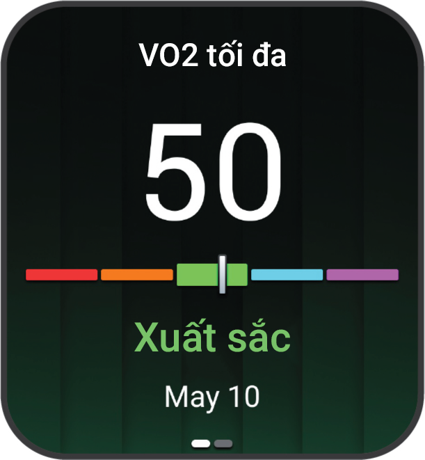 Dữ liệu VO2 tối đa được cung cấp bởi Firstbeat Analytics. Phân tích và dữ liệu VO2 tối đa được cung cấp với sự cho phép từ The Cooper Institute®. Để biết thêm thông tin, xem phụ lục (Xếp hạng theo Tiêu chuẩn VO2 tối đa), và truy cập www.CooperInstitute.org.