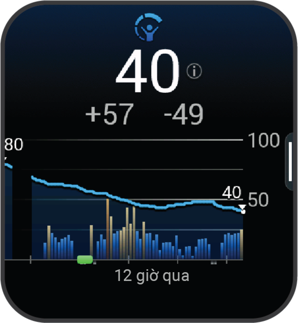 Đồng hồ của bạn phân tích sự thay đổi nhịp tim, mức độ căng thẳng, chất lượng giấc ngủ và dữ liệu hoạt động để xác định mức Năng lượng cơ thể tổng thể của bạn. Giống như một thước đo khí trên xe hơi, dữ liệu cho biết lượng năng lượng dự trữ sẵn có của bạn. Phạm vi mức Năng lượng cơ thể là từ 5 đến 100, trong đó 5 đến 25 là năng lượng dự trữ rất thấp, 26 đến 50 là năng lượng dự trữ trung bình, 51 đến 75 là năng lượng dự trữ trung bình và 76 đến 100 là năng lượng dự trữ rất cao.