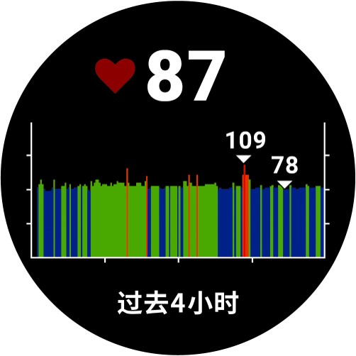 查看心率小工具心率小工具以每分钟心跳次数(bpm)显示您目前的心率与心率图表。该图表显示最近心率活动的最高与最低心率,并以彩色柱状图区分各时间内的心率区间(关于心率区间,第7页)。 在时间界面,上下滑动屏幕以查看心率小工具。 点击屏幕查看过去七天的平均静止心率(RHR)。 主页心率功能腕式心率查看心率小工具