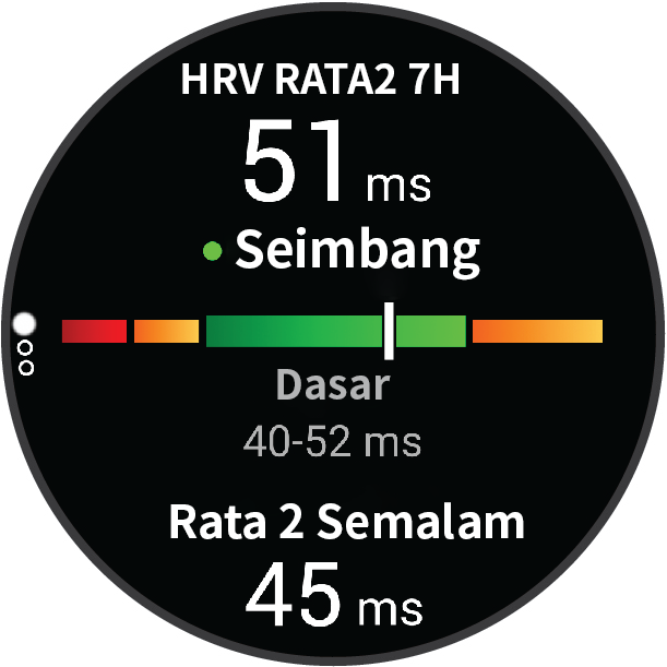Jam tangan Anda menganalisis pembacaan denyut jantung di pergelangan tangan saat Anda tidur untuk menentukan variabilitas denyut jantung (HRV). Latihan, aktivitas fisik, tidur, gizi, dan kebiasaan sehat semua berpengaruh pada variabilitas denyut jantung Anda. Nilai HRV dapat bervariasi secara luas berdasarkan gender, usia, dan tingkat kebugaran. Status HRV yang seimbang dapat mengindikasikan tanda-tanda positif kesehatan seperti olahraga yang baik dan keseimbangan pemulihan, kebugaran kardiovaskular yang lebih baik, dan ketahanan stres. Status yang tidak seimbang atau buruk dapat menjadi tanda kelelahan, kebutuhan pemulihan yang lebih, atau stres yang meningkat. Untuk hasil terbaik, Anda harus menggunakan jam tangan saat tidur. Jam tangan membutuhkan data tidur selama tiga minggu yang konsisten untuk menunjukkan status variabilitas denyut jantung Anda.