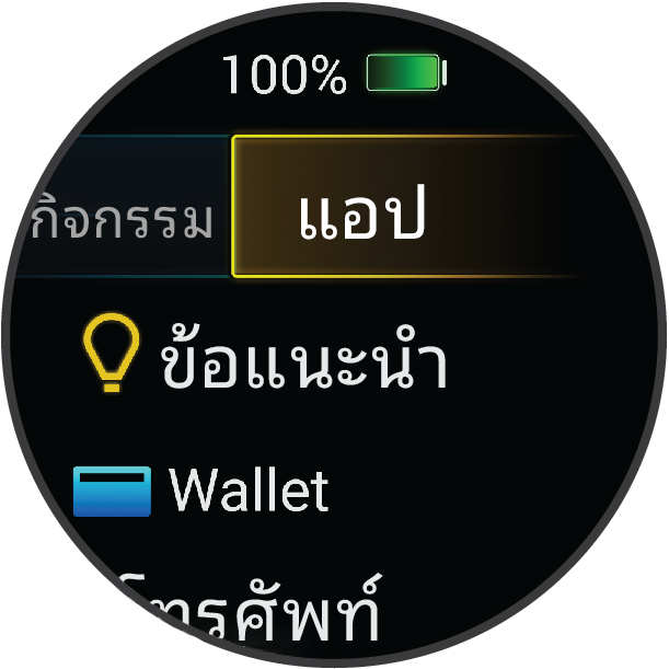 คุณสามารถปรับแต่งนาฬิกาของคุณโดยใช้เมนูแอป ซึ่งช่วยให้คุณเข้าถึงคุณสมบัตินาฬิกาและตัวเลือกได้อย่างรวดเร็ว บางแอปจำเป็นต้องเชื่อมต่อ Bluetooth กับโทรศัพท์ที่รองรับ หลายแอปยังสามารถพบได้ในภาพรวม (ภาพรวม)