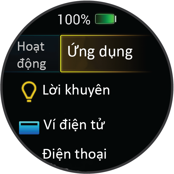 Bạn có thể tùy chỉnh đồng hồ của mình từ trình đơn ứng dụng, cho phép bạn truy cập nhanh vào các tính năng và tùy chọn của đồng hồ. Một số ứng dụng yêu cầu kết nối Bluetooth với điện thoại tương thích. Nhiều ứng dụng cũng có sẵn trong công cụ tổng quan (Công cụ tổng quan).