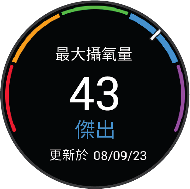 最大攝氧量估算值會以數值、描述以及彩色量表上的位置顯示於裝置上。您可以在您的 Garmin Connect 帳戶中檢視關於您的最大攝氧量估算值的更多資訊,例如該估算值在您的年齡與性別中排在哪裡。