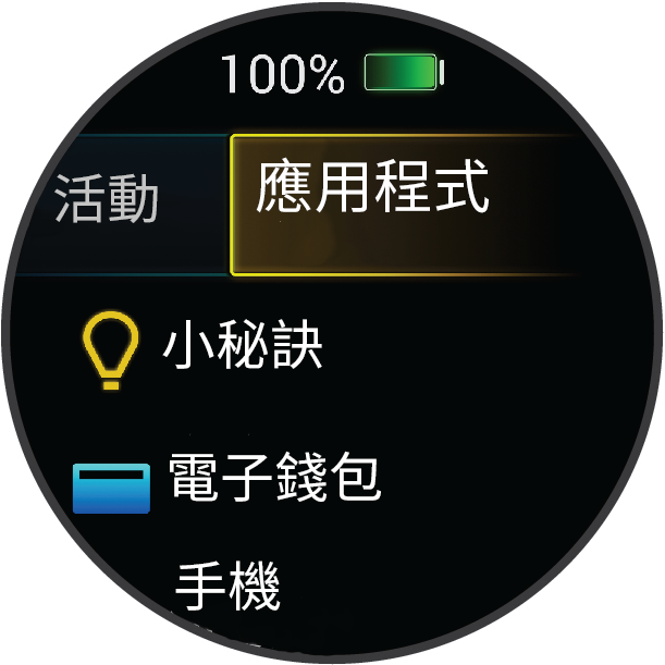 您可以使用應用程式選單自訂手錶,以快速存取手錶功能及選項。部分應用程式需要藍牙連結相容的手機。許多應用程式也可以在概覽中找到(概覽)。