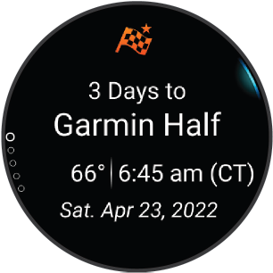 When you add a race event to your Garmin Connect calendar, you can view the event on your watch by adding the primary race glance (Glances). The event date must be in the next 365 days. The watch displays a countdown to the event, your goal time or predicted finish time (running events only), and weather information.