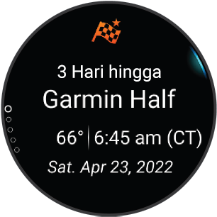 Saat Anda menambahkan acara perlombaan pada kalender Garmin Connect, Anda dapat melihat acara pada jam tangan Anda dengan menambahkan kilasan perlombaan utama (Kilasan). Tanggal acara harus berada dalam 365 hari ke depan. Jam tangan menampilkan penghitung mundur ke acara tersebut, waktu target Anda atau perkiraan waktu selesai (hanya untuk acara lari), dan informasi cuaca.