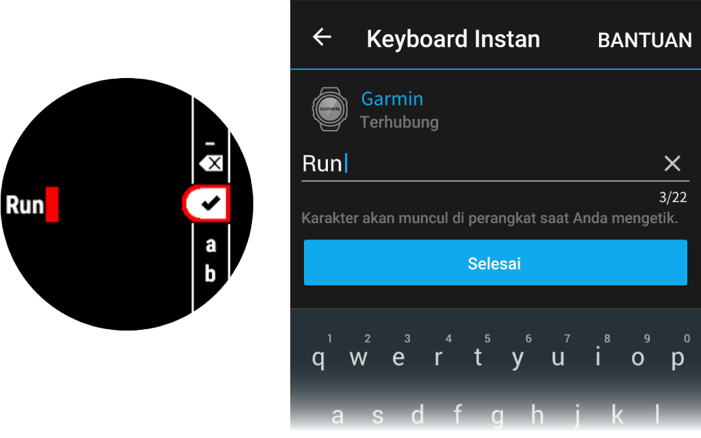 Sebuah keyboard akan muncul di aplikasi Garmin Connect setiap kali kolom teks ditampilkan pada perangkat Anda. Saat Anda mengetik pada keyboard, karakter akan muncul pada perangkat Anda secara bersamaan.