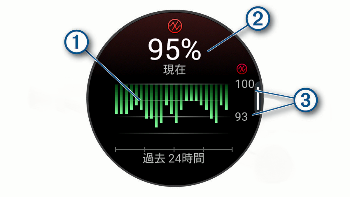 デバイスでは、血中酸素レベルはパーセンテージ(%)で表示されます。デバイスのデータをGarmin Connectアカウントに同期すると、Garmin ConnectウェブサイトやGarmin Connectアプリで、より詳細なデータを確認することができます。