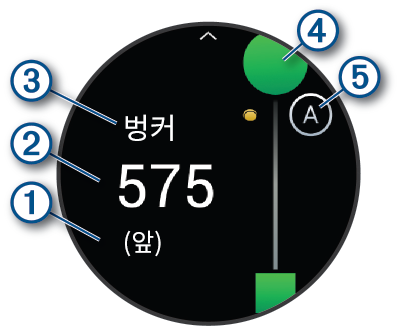 참고: 핀 위치가 변경되면, 워치는 그린의 앞쪽, 중앙, 뒤쪽까지의 거리를 다시 계산하지만, 실제 핀 위치까지의 거리는 계산하지 않습니다.