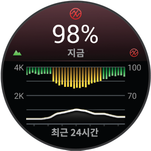 이 워치는 혈액 내의 산소 포화도 (SpO2)를 가늠하기 위한 손목 기반 펄스 옥시미터를 내장하고 있습니다. 고도가 높아지면 혈액 내 산소 수준이 감소할 수 있습니다.
